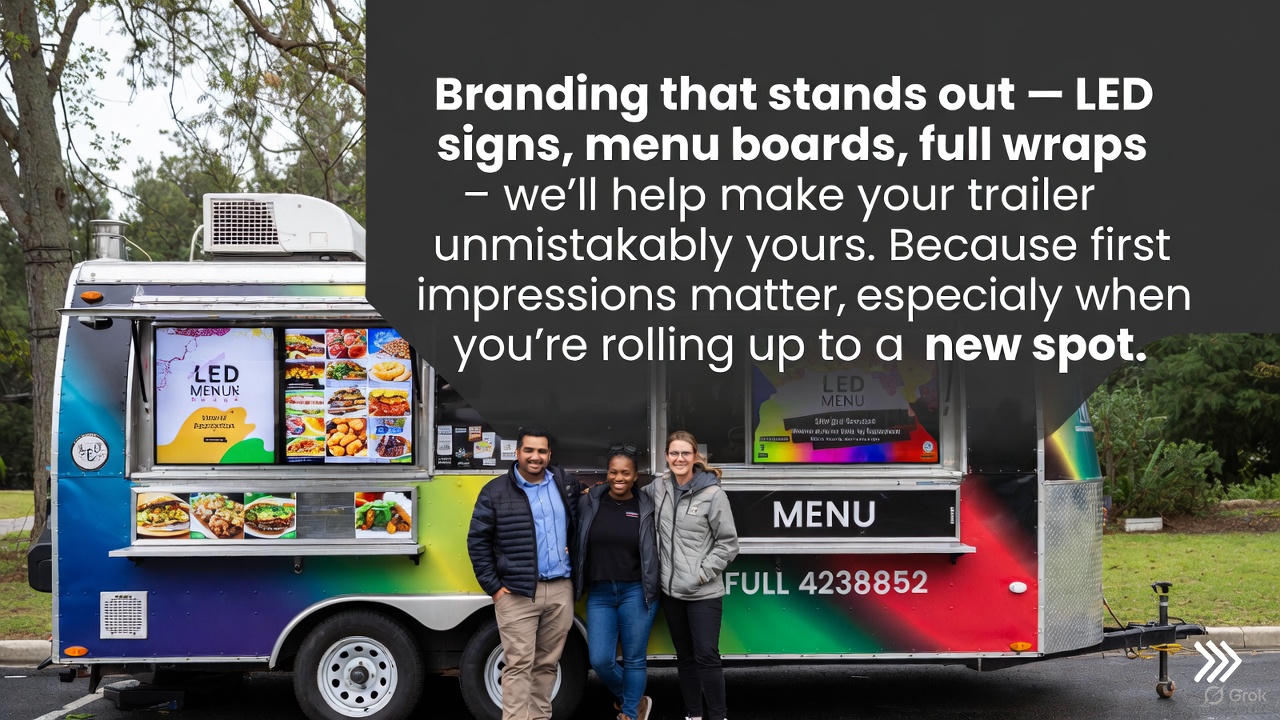 LED signs, menu boards, full wraps – we'll help make your trailer unmistakably yours. Because first impressions matter, especially when you're rolling up to a new spot.